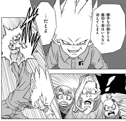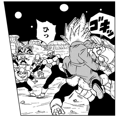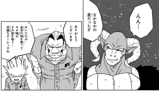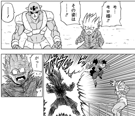 Moro est pris dans une situation délicate après avoir été attaqué par Vegeta, alors il fonce vers le vaisseau spatial pour absorber les pouvoirs de Seven-Three. Lorsque Shimorekka dit à son chef : « Seigneur Moro!! Tu n'as pas l'air en forme ! », leur chef caprin détruit le duo !