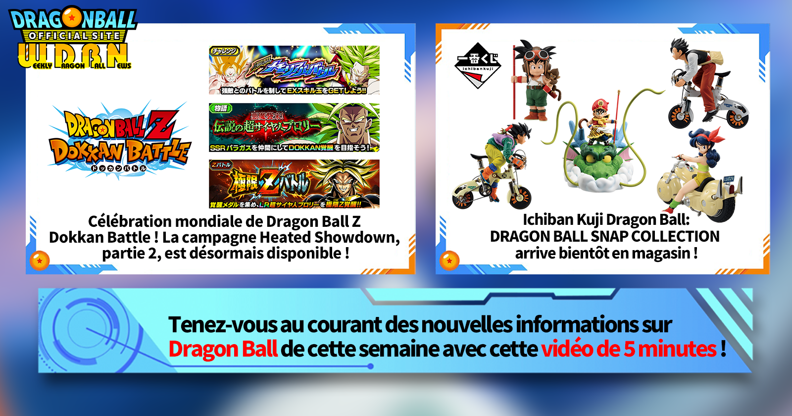 "Nouvelles hebdomadaires Dragon Ball" est une série vidéo mise à jour tous les lundis (JST) pour vous apporter les dernières nouvelles du monde de Dragon Ball! Rejoignez le rédacteur en chef de V Jump, Victory Uchida, alors qu'il couvre toutes les informations les plus importantes publiées la semaine précédente ainsi que de nouvelles mises à jour comme les informations sur les nouveaux produits et les actualités du site pour la semaine à venir !