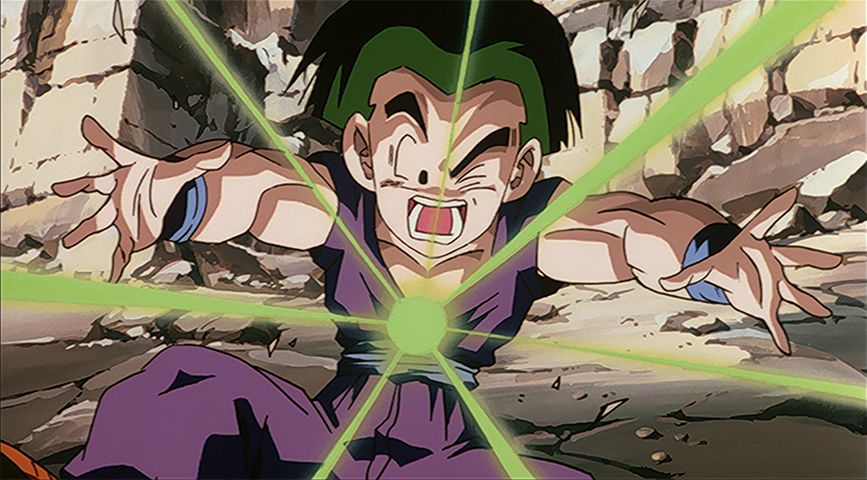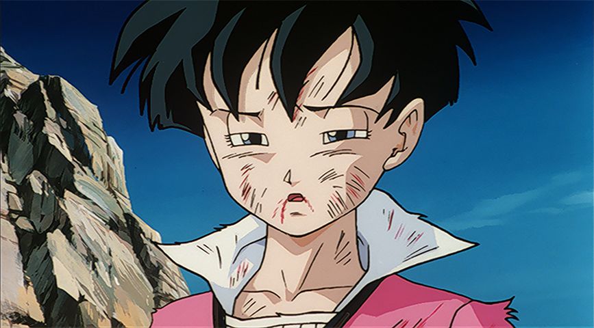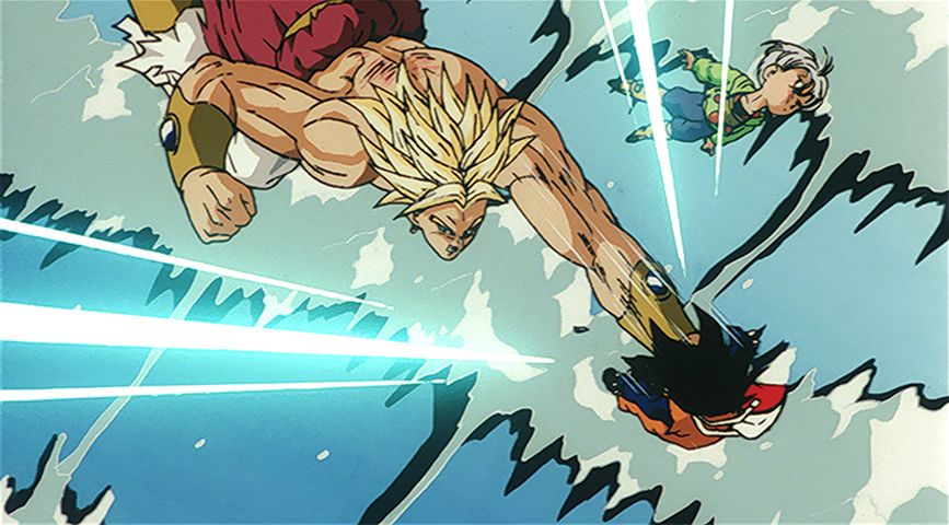 Alors qu'il combat Gohan, Broly lance des attaques énergétiques sur Videl, Goten et Trunks, qui regardent simplement de loin !