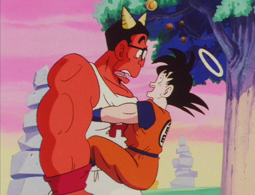 Il semble que Mezu ait l'avantage, mais Goku le distrait en menaçant de manger des fruits de l'arbre d'Enma, ce qui déstabilise suffisamment l'ogre pour lui permettre d'être marqué.