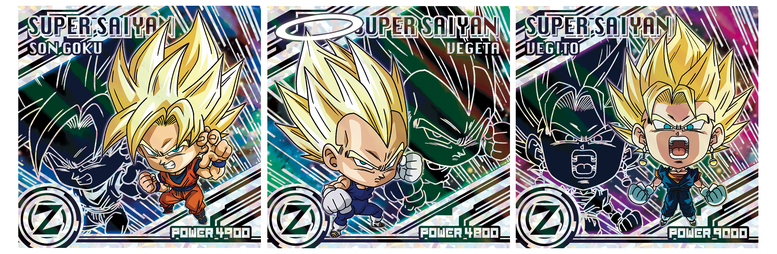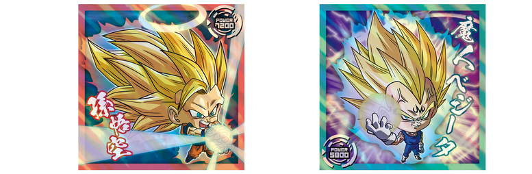 En ce qui concerne les autocollants God Rare+, nous avons Goku et Vegeta tels qu'on les voit dans leur confrontation fatidique dans l'arc Majin Buu , ainsi que certains des braves guerriers qui se sont battus vaillamment dans les films Dragon Ball Super !