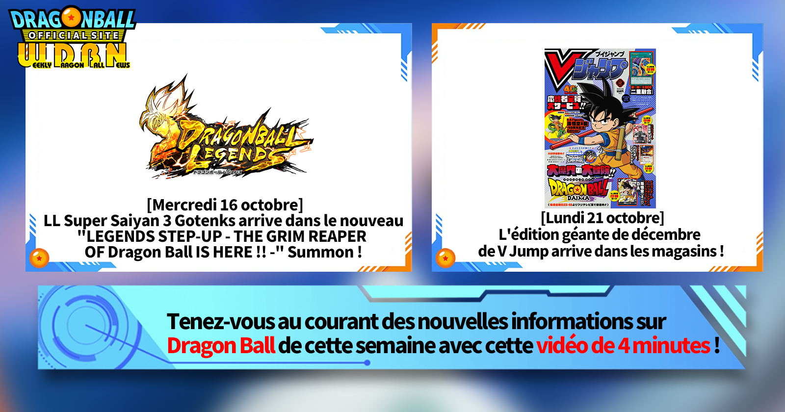 "Nouvelles hebdomadaires Dragon Ball" est une série vidéo mise à jour tous les lundis (JST) pour vous apporter les dernières nouvelles du monde de Dragon Ball! Rejoignez le rédacteur en chef de V Jump, Victory Uchida, alors qu'il couvre toutes les informations les plus importantes publiées la semaine précédente ainsi que de nouvelles mises à jour comme les informations sur les nouveaux produits et les actualités du site pour la semaine à venir !