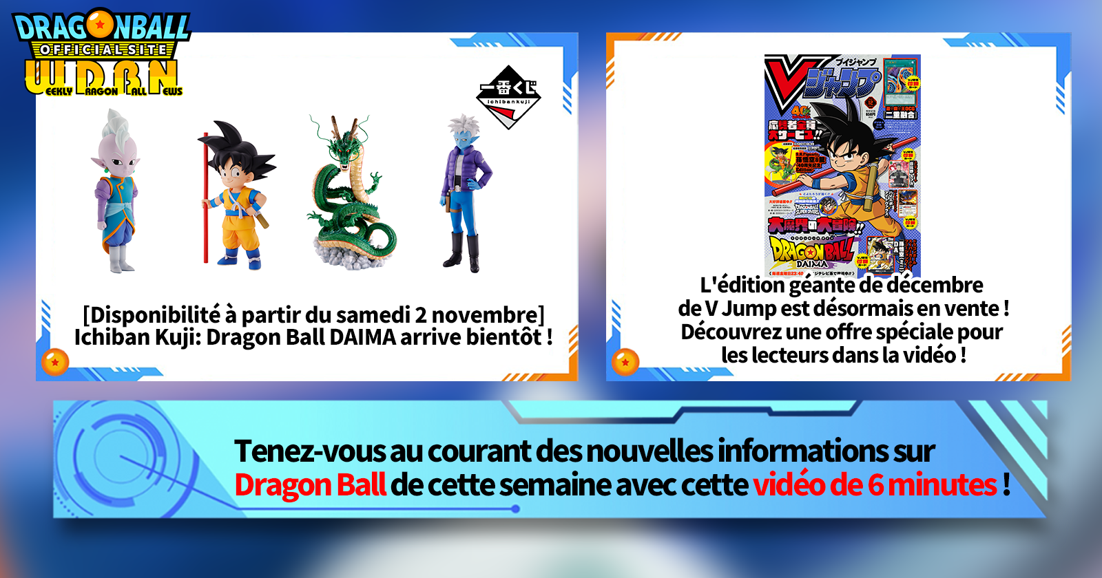 "Nouvelles hebdomadaires Dragon Ball" est une série vidéo mise à jour tous les lundis (JST) pour vous apporter les dernières nouvelles du monde de Dragon Ball! Rejoignez le rédacteur en chef de V Jump, Victory Uchida, alors qu'il couvre toutes les informations les plus importantes publiées la semaine précédente ainsi que de nouvelles mises à jour comme les informations sur les nouveaux produits et les actualités du site pour la semaine à venir !