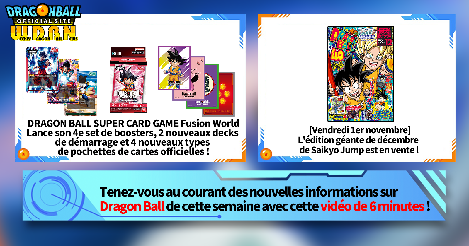 "Nouvelles hebdomadaires Dragon Ball" est une série vidéo mise à jour tous les lundis (JST) pour vous apporter les dernières nouvelles du monde de Dragon Ball! Rejoignez le rédacteur en chef de V Jump, Victory Uchida, alors qu'il couvre toutes les informations les plus importantes publiées la semaine précédente ainsi que de nouvelles mises à jour comme les informations sur les nouveaux produits et les actualités du site pour la semaine à venir !