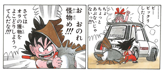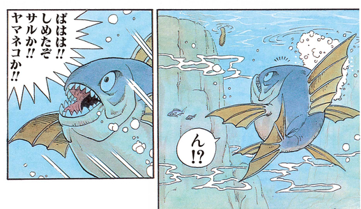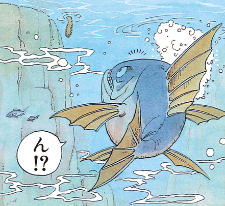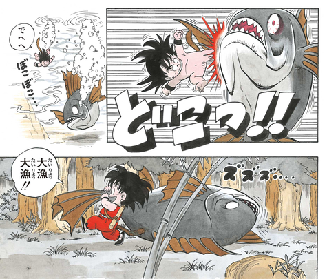 On peut voir à travers l'exclamation de Goku, "Quelle prise !! Quelle prise !! " que le poisson géant est un vrai régal pour lui. Alors qu'il rentre chez lui avec le poisson géant, il se retrouve confronté à Bulma. Ne comprenant pas la situation, Goku est furieux contre Bulma, criant, "Tu essaies de m'arracher ma proie, hein ? !!"
