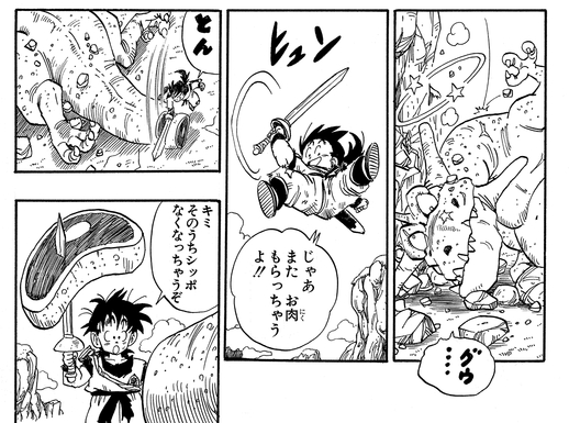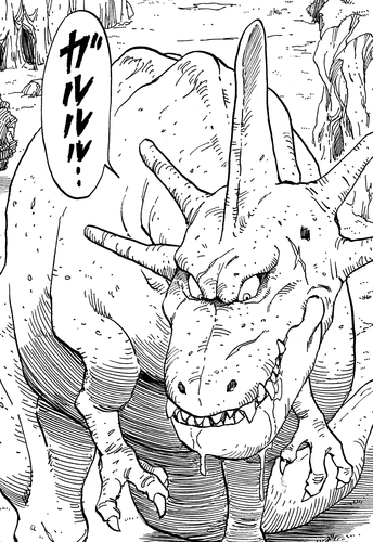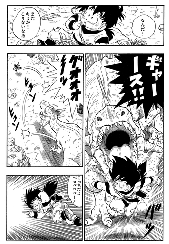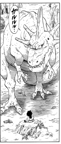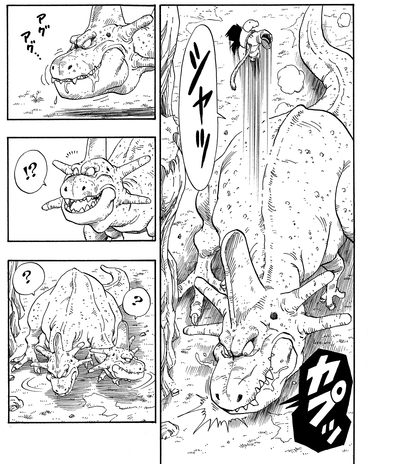 Peu importe le nombre de fois où Gohan s'est échappé, le lézard géant n'a jamais abandonné la poursuite. Il ne se doutait pas que son prétendu déjeuner devenait de plus en plus fort et deviendrait bientôt trop difficile à gérer ! Dans un retournement de situation ironique, ce dinosaure s'est retrouvé avec sa queue coupée tranche par tranche pour que le jeune guerrier en formation puisse se nourrir lui-même !
