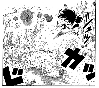 Il tente de transformer Gohan en son prochain repas alors que Piccolo l'a laissé se débrouiller seul dans le cadre de son entraînement. Cependant, le jeune demi-Saiyan parvient à s'échapper en faisant un magnifique saut jusqu'au sommet d'une falaise.