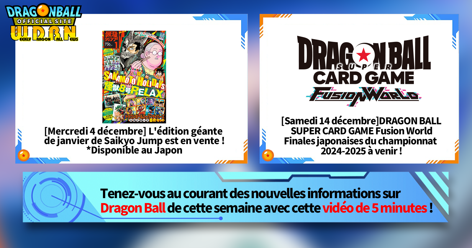 "Nouvelles hebdomadaires Dragon Ball" est une série vidéo mise à jour tous les lundis (JST) pour vous apporter les dernières nouvelles du monde de Dragon Ball! Rejoignez le rédacteur en chef de V Jump, Victory Uchida, alors qu'il couvre toutes les informations les plus importantes publiées la semaine précédente ainsi que de nouvelles mises à jour comme les informations sur les nouveaux produits et les actualités du site pour la semaine à venir !