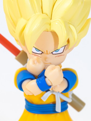 Malgré la petite taille de cette figurine, son cadre spécialement conçu associé au matériau souple utilisé au niveau de la poitrine permet une grande liberté de mouvement ! Vous pouvez même croiser les bras de Super Saiyan Goku (Mini) devant !