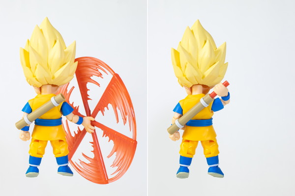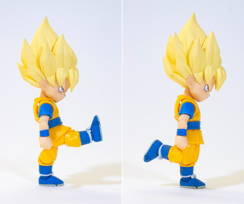 Des parties souples ont également été utilisées autour des jambes et de la taille de l'uniforme du mini Saiyan, permettant une amplitude de mouvement impressionnante. Vous pouvez même balancer les jambes d'avant en arrière, le tout sans compromettre la silhouette de la figurine !