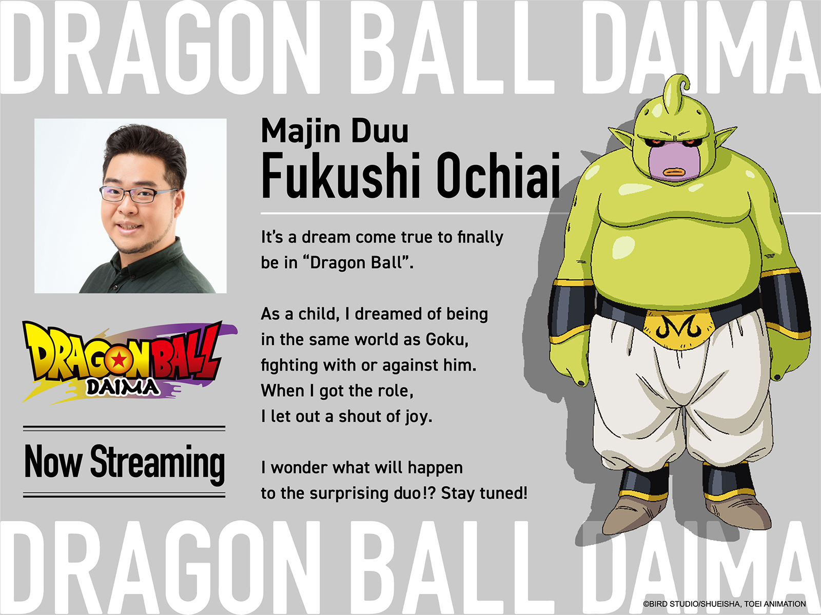 With a striking semblance to Majin Buu and the words “I want chocolate!”, Majin Duu left quite the impression with their episode 11 appearance! Fukushi Ochiai was announced as the VA, and he kindly provided us with a comment!