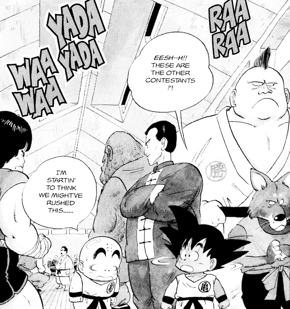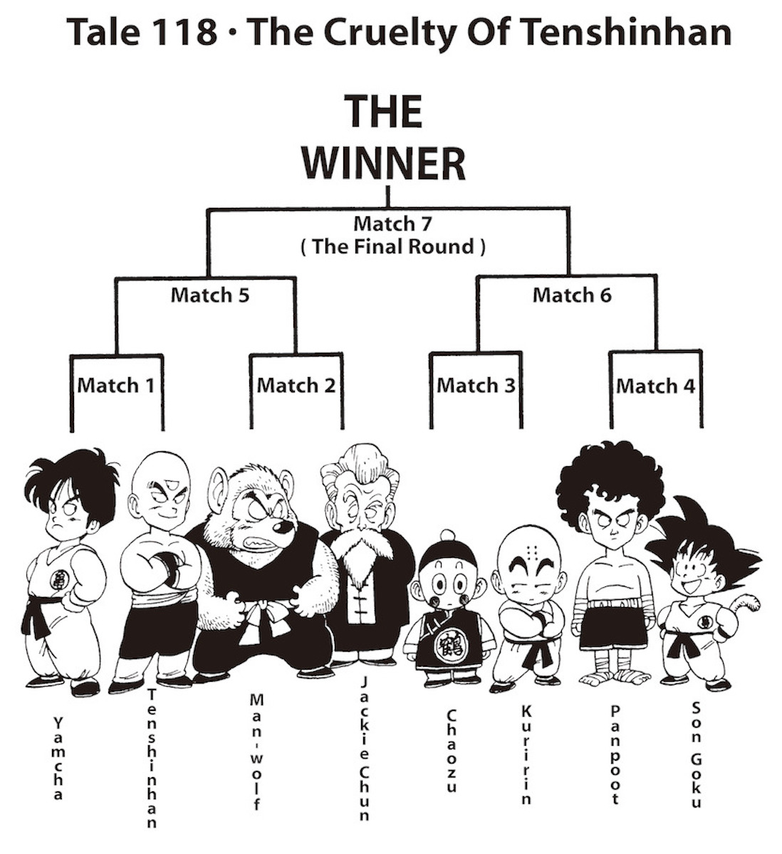 —Parlons maintenant de quelques règles théoriques pour une compétition de Tenkaichi Budokai . La 22e édition du Tenkaichi Budokai, dont Tenshinhan est sorti vainqueur, était particulièrement difficile. Il n'y avait pas de limite de temps pour les tours de qualification, ni pour les sept tours de l'événement principal. Cela signifie que le vainqueur aurait dû combattre dans un total d'au moins cinq matchs, y compris les préliminaires, en une seule journée. Ce n'est tout simplement pas possible dans la réalité, c'est donc un tournoi vraiment fou.