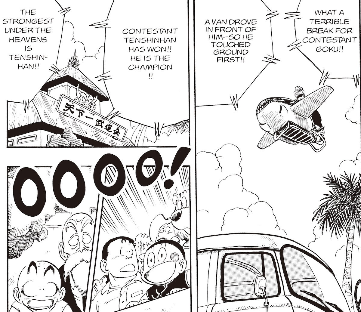 Avec la victoire en vue, Goku est heurté par une voiture et tombe au sol devant Tenshinhan, entraînant sa défaite