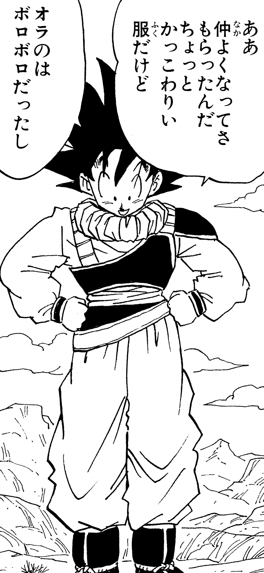 Globe-trotter aventureux qu'il est, Goku se procure souvent de nouveaux vêtements des différents endroits qu'il parcourt, et sa garde-robe est donc assez variée. Après avoir terminé son entraînement avec Kami, il s'est présenté au Tenkaichi Budokai vêtu d'une tenue de type moine avec un parapluie en papier. Ses cheveux étaient également coiffés d'un turban : quelque chose qu'il avait appris de Mr. Popo, peut-être ? Il a également reçu de nouveaux vêtements des Yardratians après avoir à peine réussi à s'échapper de la Planet Namek. Les volants volumineux autour de son cou sont étrangement ajustés, vous ne trouvez pas ? L'attelle sur son épaule gauche et la ceinture décorative se démarquent vraiment dans ce design asymétrique !
