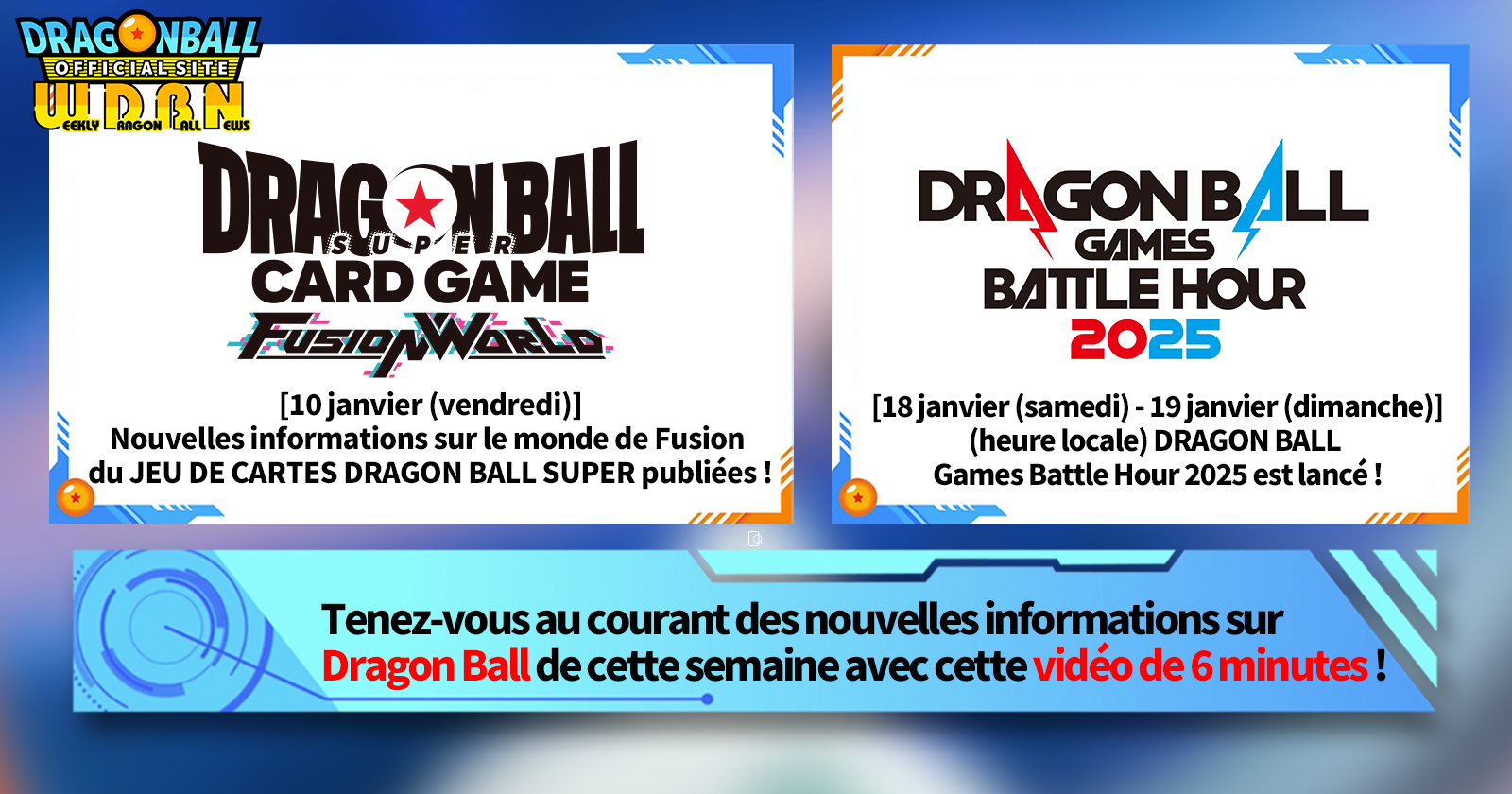 "Nouvelles hebdomadaires Dragon Ball" est une série vidéo mise à jour tous les lundis (JST) pour vous apporter les dernières nouvelles du monde de Dragon Ball! Rejoignez le rédacteur en chef de V Jump, Victory Uchida, alors qu'il couvre toutes les informations les plus importantes publiées la semaine précédente ainsi que de nouvelles mises à jour comme les informations sur les nouveaux produits et les actualités du site pour la semaine à venir !