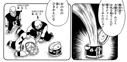 Sacrifiant sa propre vie, Mutaito libère sa technique secrète Mafu-ba , piégeant le Great Demon King Piccolo dans un pot électronique scellé par magie.