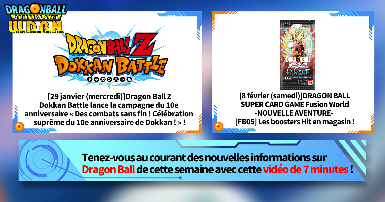 "Nouvelles hebdomadaires Dragon Ball" est une série vidéo mise à jour tous les lundis (JST) pour vous apporter les dernières nouvelles du monde de Dragon Ball! Rejoignez le rédacteur en chef de V Jump, Victory Uchida, alors qu'il couvre toutes les informations les plus importantes publiées la semaine précédente ainsi que de nouvelles mises à jour comme les informations sur les nouveaux produits et les actualités du site pour la semaine à venir !