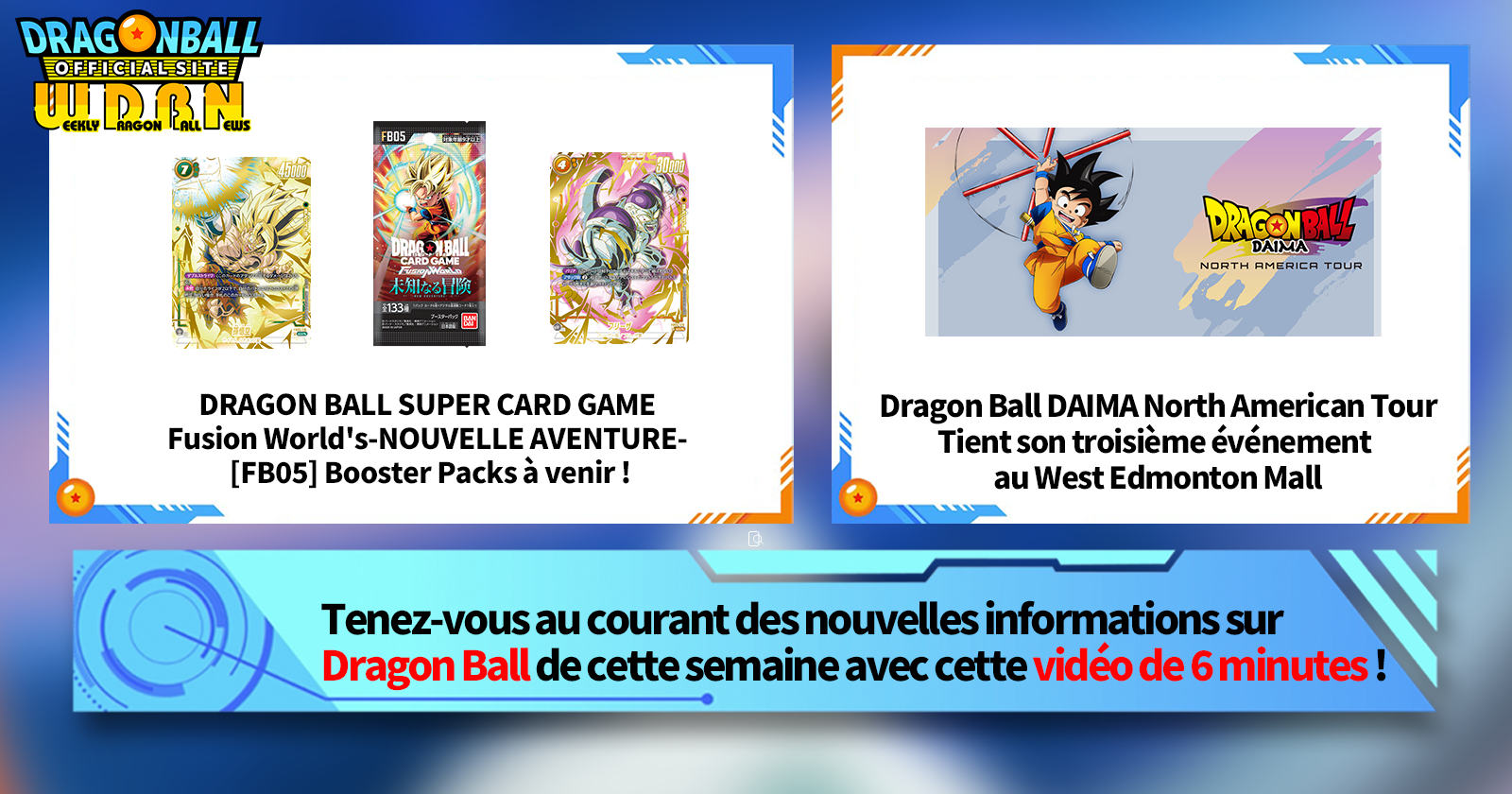 "Nouvelles hebdomadaires Dragon Ball" est une série vidéo mise à jour tous les lundis (JST) pour vous apporter les dernières nouvelles du monde de Dragon Ball! Rejoignez le rédacteur en chef de V Jump, Victory Uchida, alors qu'il couvre toutes les informations les plus importantes publiées la semaine précédente ainsi que de nouvelles mises à jour comme les informations sur les nouveaux produits et les actualités du site pour la semaine à venir !