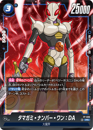 La carte bonus de ce numéro est la carte "Tamagami Number One: DA", représentant la divinité protectrice du Dragon Ball du Premier Monde des Démons ! Lorsque votre Leader est "Vegeta (Mini): DA ", cette carte augmente le coût de vos Cartes de Combat dans votre Zone de Combat de un ! La force de cette carte est qu'elle peut entraver les compétences de votre adversaire qui peuvent être utilisées pour retirer des Cartes de Combat à un coût spécifié !