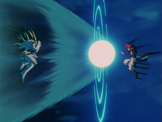 Enragé, Yi-Shinron tire alors une énorme Power Ball d' Negative Energy condensée. Mais en éloignant la balle de la Terre, Gogeta ajoute une dose de sa propre Positive Energy. La balle explose, dissipant le miasme sombre qui enveloppe le monde.