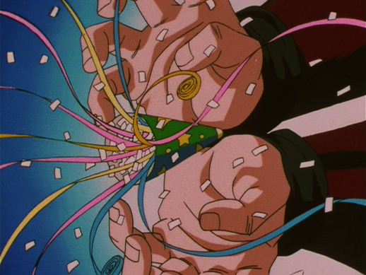 Gogeta se divise en cinq apparitions et tente de tirer cinq Kamehamehas distincts à la fois... mais il choisit de taquiner Yi-Shinron en tirant cinq confettis à la place.