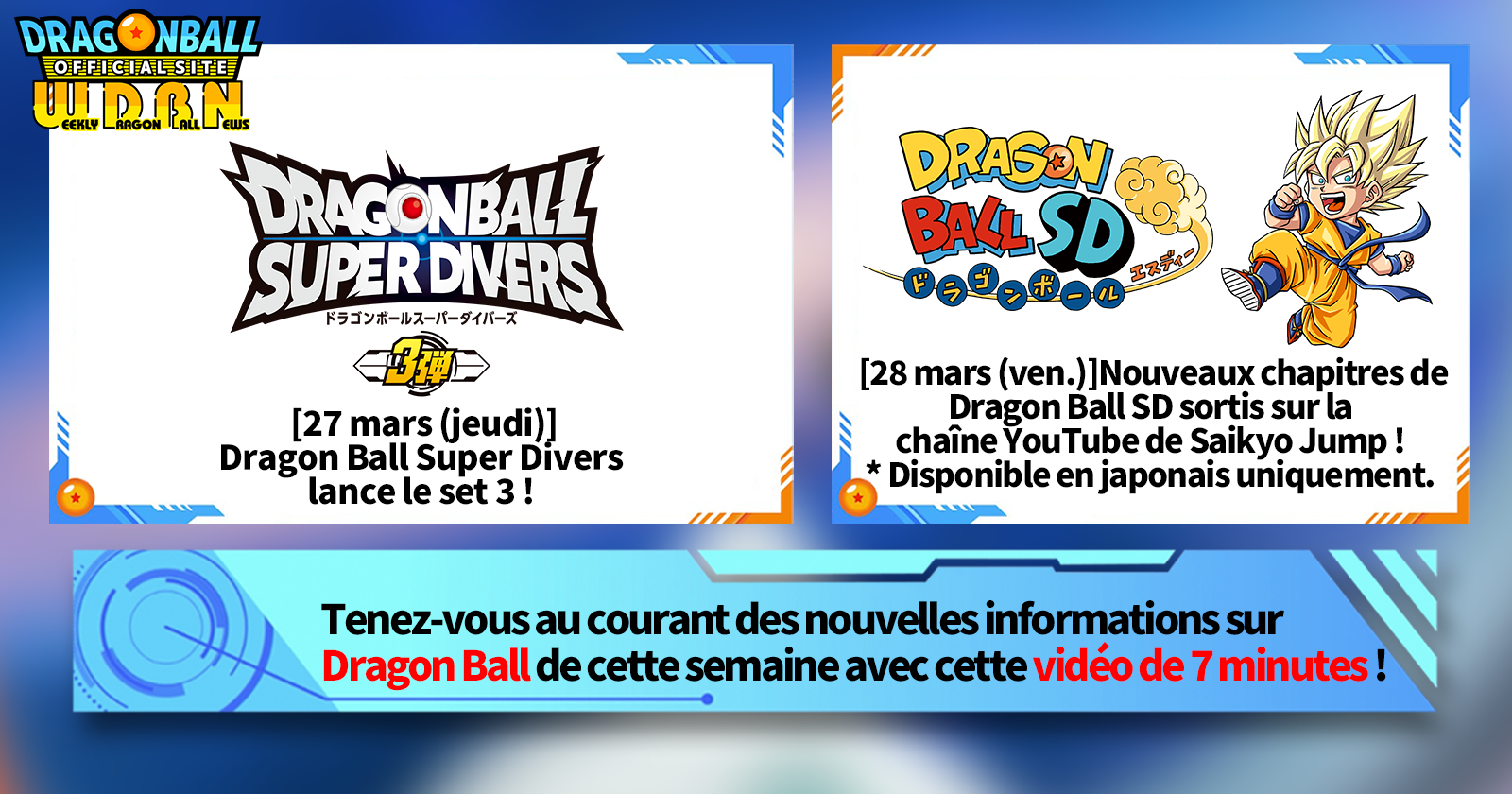 « Nouvelles hebdomadaires Dragon Ball» est une série vidéo mise à jour chaque lundi (JST) pour vous présenter les dernières actualités de Dragon Ball! Rejoignez Victory Uchida, rédacteur en chef de V Jump , qui vous présentera les dernières infos de la semaine précédente, ainsi que les dernières actualités comme les nouveautés produits et les actualités du site pour la semaine à venir !