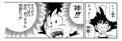 Kami a adopté le nom lorsqu'il a emprunté le corps d'un vieil homme pour entrer dans le Tenkaichi Budokai, et comme en japonais "Shen" est une autre prononciation du caractère kanji pour "Kami", Goku a pu découvrir sa véritable identité !