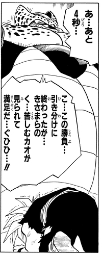 Makino : Oui ! J'aimerais réciter ma réplique préférée de Cell! « Ha ha ha ha ha ! Encore dix secondes et la Terre sera de l'histoire ancienne ! ... On va dire que c'est un match nul ! »