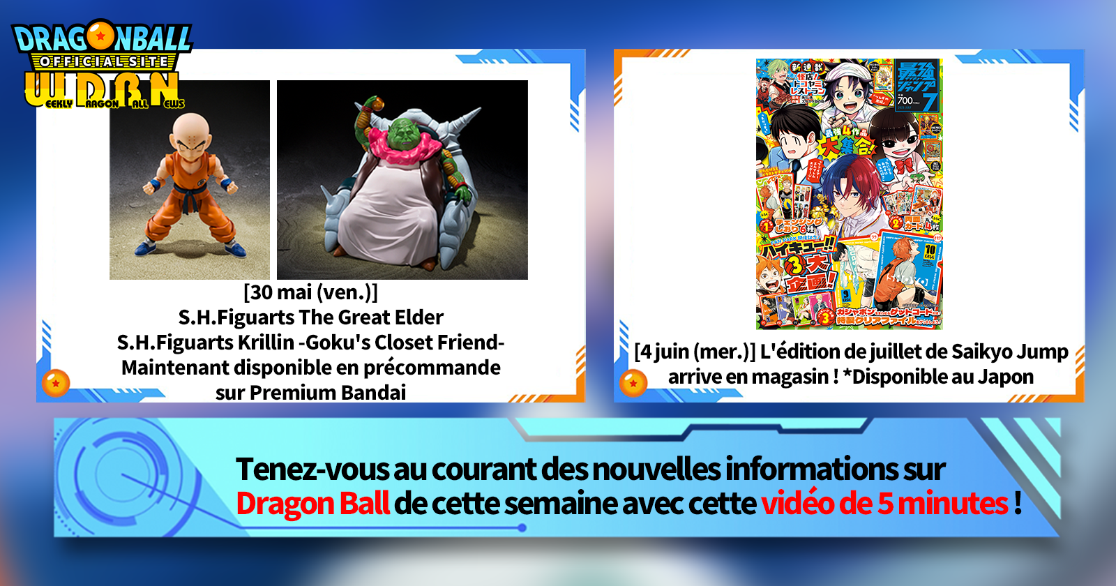 « Nouvelles hebdomadaires Dragon Ball» est une série vidéo mise à jour chaque lundi (JST) pour vous présenter les dernières actualités de Dragon Ball! Rejoignez Victory Uchida, rédacteur en chef de V Jump , qui vous présentera les dernières infos de la semaine précédente, ainsi que les dernières actualités comme les nouveautés produits et les actualités du site pour la semaine à venir !