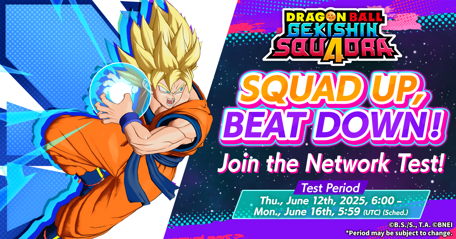 Une bande-annonce annonçant le nouveau titre, DRAGON BALL GEKISHIN SQUADRA, ainsi que le test réseau prévu pour le 12 juin (JST), est désormais disponible ! Cette vidéo dévoile également les nouveaux personnages ajoutés depuis la bêta ouverte d'août dernier ! Suivez le compte officiel X pour découvrir encore plus de nouveaux personnages !