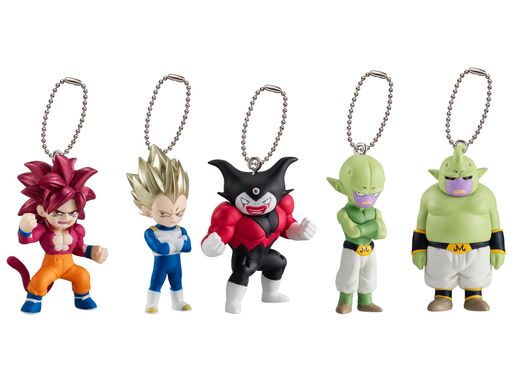 Ce troisième ensemble de porte-clés oscillants à collectionner présente cinq personnages différents, tous présents dans la bataille décisive de Dragon Ball DAIMA : Super Saiyan 4 Goku (Mini), Super Saiyan Vegeta (Mini), Third Eye Gomah, Majin Kuu et Majin Duu !