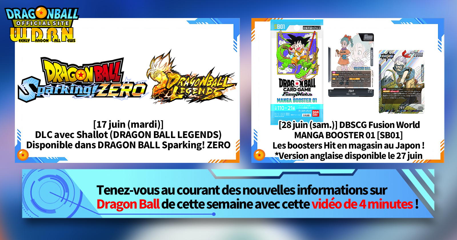 « Nouvelles hebdomadaires Dragon Ball» est une série vidéo mise à jour chaque lundi (JST) pour vous présenter les dernières actualités de Dragon Ball! Rejoignez Victory Uchida, rédacteur en chef de V Jump , qui vous présentera les dernières infos de la semaine précédente, ainsi que les dernières actualités comme les nouveautés produits et les actualités du site pour la semaine à venir !