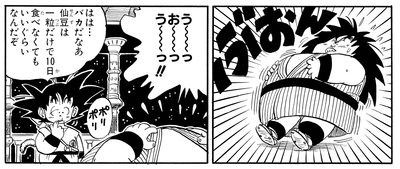 Après avoir appris que le festin que Goku lui avait promis n'était que quelques haricots Senzu maigres, il les a tous engloutis avec avidité et a fini par ne plus pouvoir bouger en conséquence !