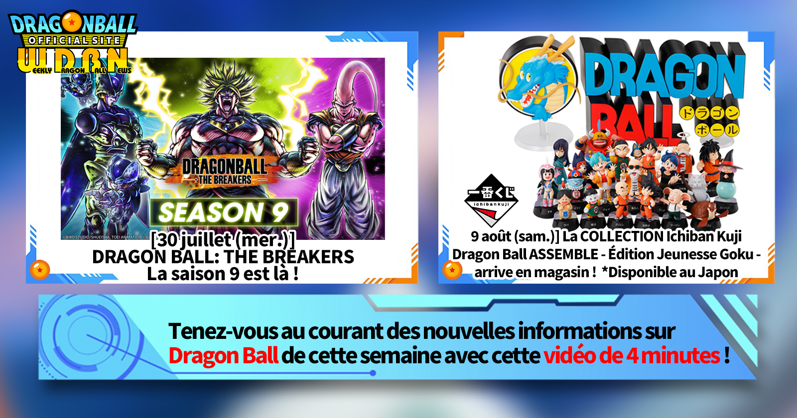 « Nouvelles hebdomadaires Dragon Ball» est une série vidéo mise à jour chaque lundi (JST) pour vous présenter les dernières actualités de Dragon Ball! Rejoignez Victory Uchida, rédacteur en chef de V Jump , qui vous présentera les dernières infos de la semaine précédente, ainsi que les dernières actualités comme les nouveautés produits et les actualités du site pour la semaine à venir !