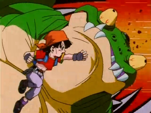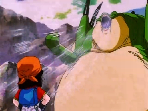 Liang-Shinron, furieux, répond : « Ah bon ? Je t'observe depuis des années, et franchement, tu ne sais pas dans quoi tu t'embarques ! » Cependant, Pan le gifle si fort que le dragon s'écrase dans une falaise !