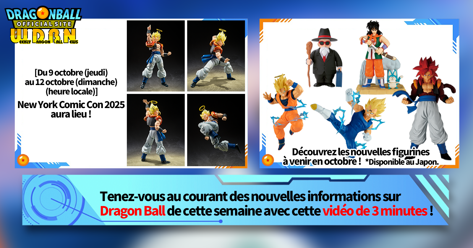 « Nouvelles hebdomadaires Dragon Ball» est une série vidéo mise à jour tous les lundis (JST) pour vous présenter les dernières actualités de Dragon Ball! Rejoignez Victory Uchida, rédacteur en chef de V Jump , qui vous présentera les dernières infos de la semaine précédente, ainsi que les dernières actualités comme les nouveaux produits et les actualités du site pour la semaine à venir !