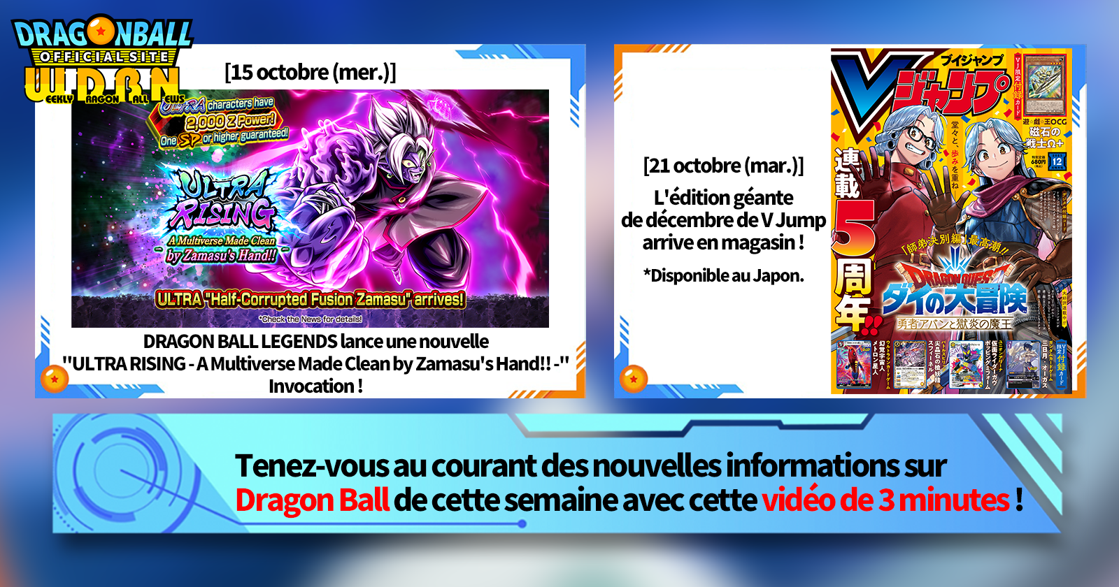 « Nouvelles hebdomadaires Dragon Ball» est une série vidéo mise à jour tous les lundis (JST) pour vous présenter les dernières actualités de Dragon Ball! Rejoignez Victory Uchida, rédacteur en chef de V Jump , qui vous présentera les dernières infos de la semaine précédente, ainsi que les dernières actualités comme les nouveaux produits et les actualités du site pour la semaine à venir !