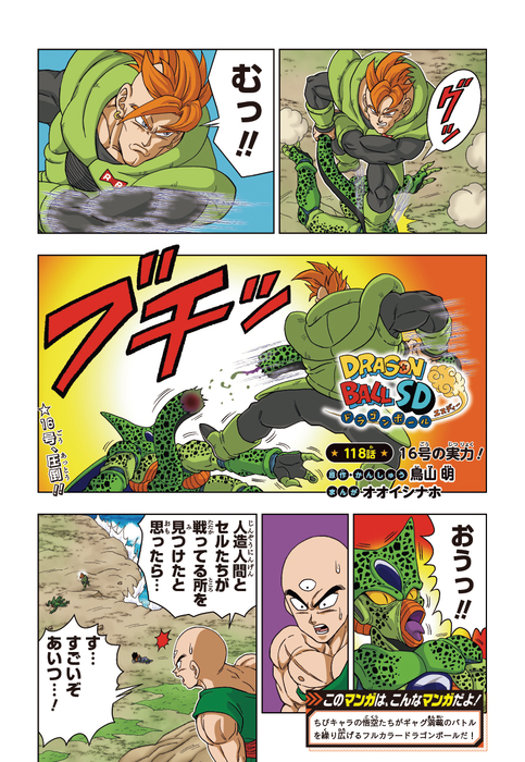 Après s'être contenté d'observer le combat jusqu'à présent, Android 16 affronte enfin Cell! Tous sont stupéfaits par sa véritable force, qui égale, voire surpasse, celle de Cell, lequel a déjà prouvé posséder une puissance supérieure à celle de Piccolo et de Android 17.