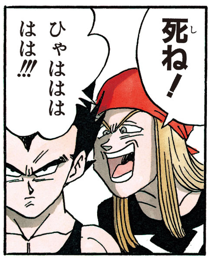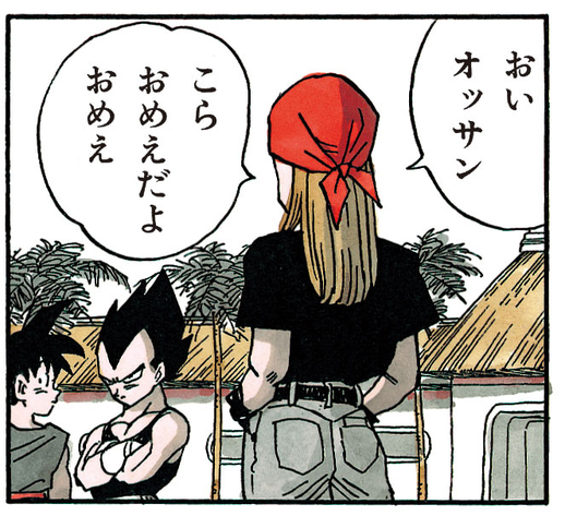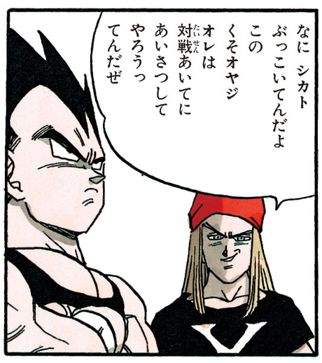 Le jeune combattant salue Vegeta d'un « Salut, mec » désinvolte, mais le Saiyan ne lui jette même pas un regard. Furieux, il s'écrie : « Tu te prends pour qui ? Je te parle ! » Et pour provoquer son adversaire, il se plante devant Vegeta en le narguant : « Ha ! Tu vas te faire démolir, mec ! »