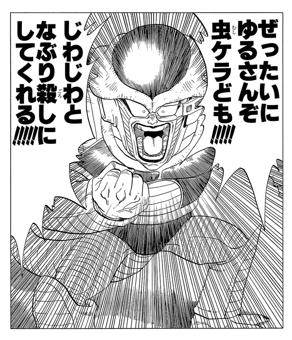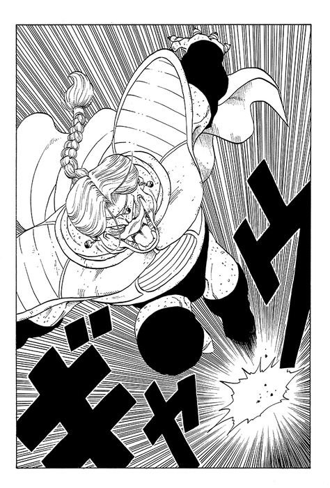 Bien que Goku parvienne à récupérer son corps, il est conduit à une Medical Machine pour soigner ses graves blessures de combat. Gohan utilise les Dragon Balls pour ranimer Piccolo et le téléporte aussitôt sur Planet Namek, lorsque Frieza apparaît soudainement devant eux. La case ci-dessous montre un Frieza furieux hurlant à pleins poumons, après avoir vu les Dragon Balls se transformer en pierre alors qu'il lui restait un vœu.