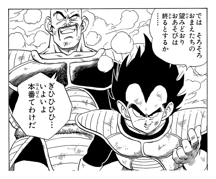 Un à un, Nappa terrasse impitoyablement ses adversaires grâce à des attaques dévastatrices, mais au moment le plus critique, notre héros Goku arrive enfin ! Goku met Nappa hors de combat grâce à la technique du Kaio-Ken apprise auprès de Kai du Nord, après quoi lui et Vegeta se retirent dans une région plus isolée pour s'affronter. Nous avons sélectionné une case illustrant la conversation emblématique entre Goku et Vegeta juste avant leur duel.