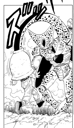 Le nouveau venu se nomme Cell , un androïde créé dans le futur par un superordinateur appartenant au Dr. Gero, scientifique de Red Ribbon Army, à partir de cellules prélevées sur Goku, Piccolo, Frieza et d'autres. Après avoir voyagé dans le passé grâce à une machine à remonter le temps pour absorber les androïdes 17 et 18 et atteindre sa Perfect Form, Cell commence par drainer la force vitale de plusieurs humains sacrifiés, ce qui lui confère une puissance surpassant celle de Kami et Piccolo fusionnés. Durant son combat contre Android 16, Cell jette son dévolu sur sa prochaine cible : Android 17. L'image ci-dessous illustre le moment où Android 17 baisse sa garde, offrant à Cell l'opportunité de passer à l'attaque.