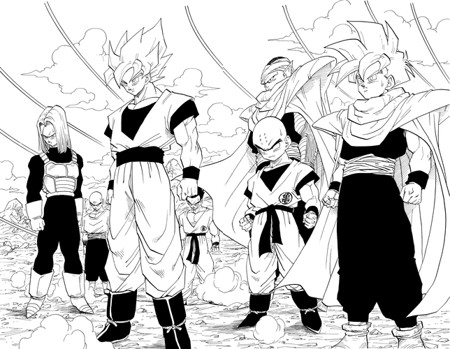 Cette illustration occupait une double page entière et se distinguait par le contraste entre Goku, souriant et semblant presque apprécier la situation, et les expressions nerveuses de Gohan et des autres. Après une brève intermède où apparaît Mr. Satan , le combat entre Goku et Cell commence enfin.