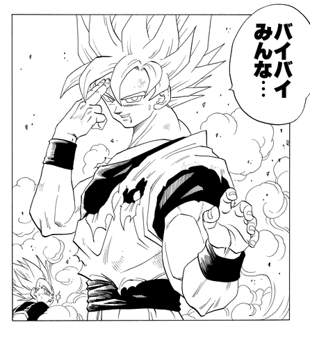 Sur les conseils de Vegeta, avec l'aide de Kaio Shin et le soutien de Mr. Satan pour rallier les Terriens, Goku parvient à créer un Genki-Dama colossal et le lance sur Majin Buu (Pure), le détruisant complètement. Goku espère qu'un jour Majin Buu renaîtra et qu'ils pourront s'affronter à nouveau, et conclut par un joyeux « À bientôt ! », révélant ainsi le véritable esprit de Goku : un Saiyan passionné de combat, mais d'une douceur inébranlable jusqu'au bout.