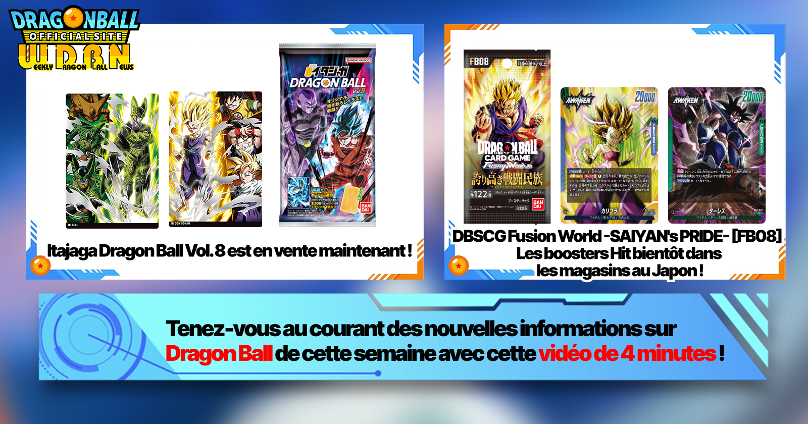 « Nouvelles hebdomadaires Dragon Ball» est une série vidéo mise à jour chaque lundi (heure japonaise) pour vous apporter les dernières nouvelles du monde de Dragon Ball! Retrouvez Victory Uchida, rédacteur en chef de V Jump , qui passe en revue toutes les informations les plus importantes de la semaine précédente, ainsi que les nouveautés comme les infos sur les nouveaux produits et les actualités du site pour la semaine à venir !