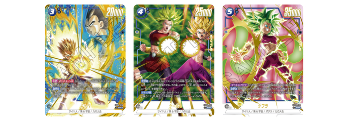 Les cartes SR Alt-Art « Bleues » représentent « Cabba», « Kale» et « Kefla», des guerriers de Universe 6 ayant participé au Tournament of Power dans Dragon Ball Super! « Kale» possède une compétence d'entrée en jeu exceptionnelle qui vous permet de jouer jusqu'à une carte de combat de coût 3 ou moins et possédant « Tournament of Power» parmi ses caractéristiques spéciales depuis votre main. Vous pouvez même utiliser cette compétence pour jouer « Cabba» ! De plus, « Cabba» dispose d'une puissante compétence vous permettant de placer jusqu'à une carte de combat adverse au-dessous du deck de son propriétaire, vous offrant ainsi un avantage décisif !