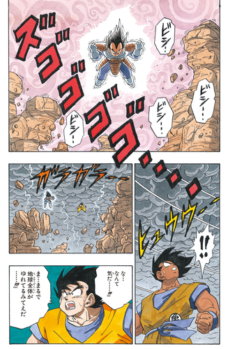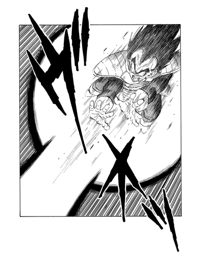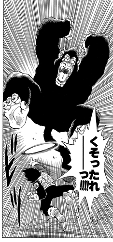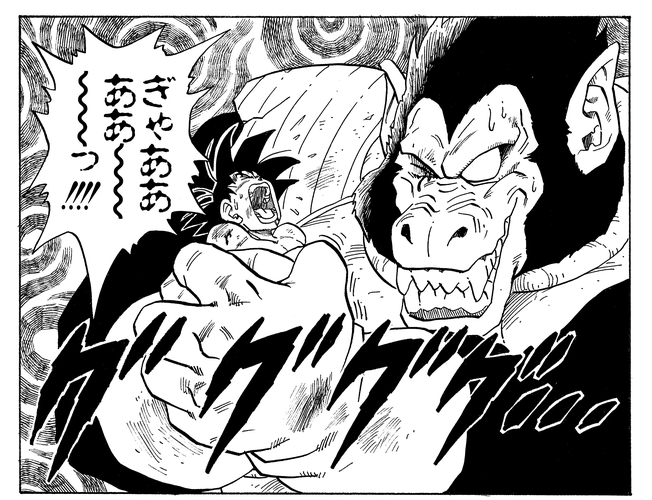Vegeta parvient à couper la queue de Gohan et semble tiré d'affaire, mais lorsque Gohan tombe au sol, Vegeta se retrouve écrasé sous le poids colossal du grand singe.