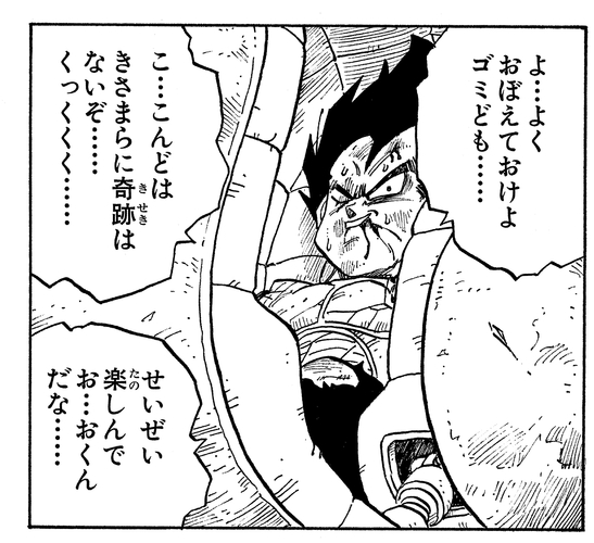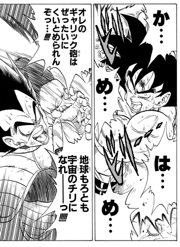 Blessé dans son orgueil par la contre-attaque de Goku utilisant le Kaio-Ken: Kaio-Ken Times Three, Vegeta , fou de rage, hurle : « Prépare-toi à mourir avec ce monde que tu aimes ! » en lançant son attaque signature, le Galick Gun. Cependant, Goku parvient à dévier cette attaque avec le Kaio-Ken: Kaio-Ken Times Four et un Kamehameha .
