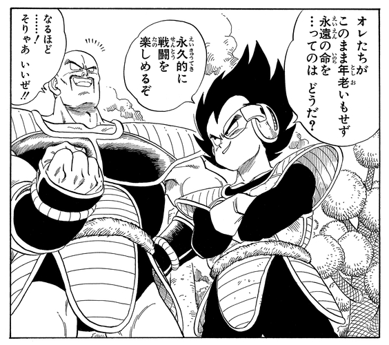 Les deux apprennent l'existence des Dragon Balls grâce à Raditz, qui a été vaincu par Goku et Piccolo, et sont maintenant venus envahir la Terre pour obtenir la vie éternelle.