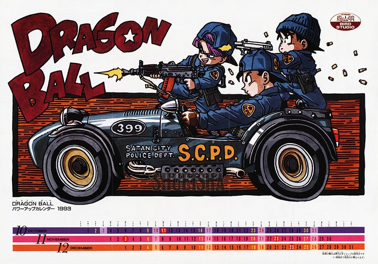 Cette illustration figurait sur la page d'octobre à décembre du calendrier Dragon Ball Power Up, offert en bonus avec un numéro du Weekly Shonen Jump. Elle représente Gohan, Goten et Trunks tels qu'ils apparaissent lors du 25e Tenkaichi Budokai, mais entassés dans une voiture du département de police de Satan City au look vraiment stylé et portant des uniformes assortis, dignes des forces spéciales !